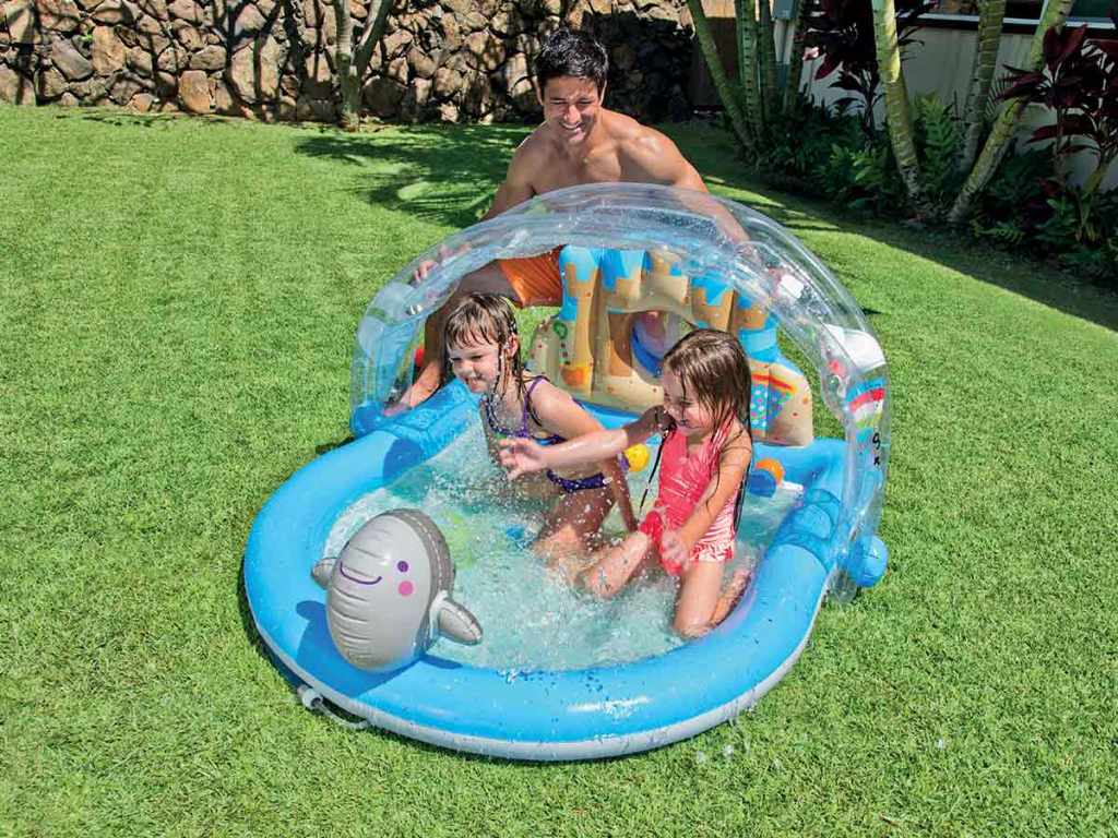 Яркий, оригинальный надувной бассейн Пляж будет не только любимым местом игр детворы в летние жаркие деньки, он также украсит участок загородного дома. Особое внимание привлекает красочное оформление комплекса.  Дно бассейна и заборчик украшают чудные картинки. Надувной навес укроет от прямых солнечных лучей. А множество фонтанчиков, расположенных по всему периметру, не оставят равнодушными даже взрослых.