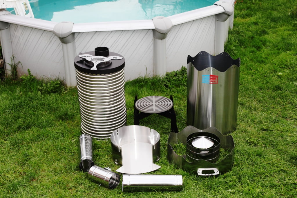 Заполненный водой бассейн подключается к спиральному водонагревателю при помощи стандартных шлангов через насос от бассейна. Внутри нагревателя разводится костер. Вода, проходя через спирали, нагревается и возвращается в бассейн по обратной трубе. Вам же остается только немного подождать, пока вода прогреется до нужной температуры.